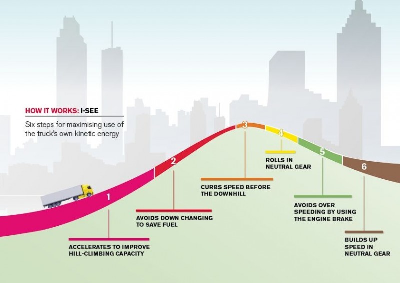 „I-See je autopilot spojený s tempomatem nákladního vozidla, který zajišťuje a řídí řazení rychlostních stupňů, přidává plyn a brzdí na svazích a zajišťuje, aby to vše probíhalo s nejvyšší možnou úsporou paliva. Systém I-See maximálně využívá jízdy na volnoběh, takže na určitých úsecích trasy se nespotřebovává téměř žádné palivo,“ řekl k funkci systému product manager společnosti Volvo Trucks Hayder Wokil.