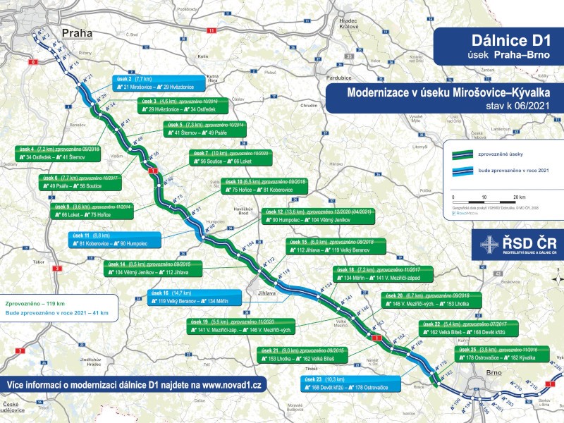 Premiér Andrej Babiš na včerejším briefingu na odpočívce Poddubí na D1 připomněl, že ze 160 kilometrů D1 určených k opravě zbývá dokončit posledních 33,5 kilometru. Náklady na kompletní rekonstrukci vyčíslil na 24 miliard korun.