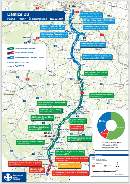 Téměř 20 kilometrů dlouhý dálniční obchvat Českých Budějovic otevřelo ŘSD v prosinci roku 2024. Spolu s ním také 8,5 kilometru dlouhou část D3 od Třebonína ke Kaplici – nádraží. Letos ŘSD otevře nejjižnější úsek D3 Nažidla – Dolní Dvořiště a první část úseku od Kaplice – nádraží k Nažidlům. „Letos v srpnu už tak budeme s dálnicí D3 v Rakousku,“ uvedl Jan Rýdl. Celá jihočeská D3 bude hotová v roce 2027. V provozu je nyní téměř 100 kilometrů dálnice D3, která propojí Prahu s Českými Budějovicemi a s rakouskými hranicemi. Celá dálnice D3 bude dlouhá 170 kilometrů, z Prahy k hranicím včetně všech středočeských částí ji ŘSD plánuje postavit do roku 2032.