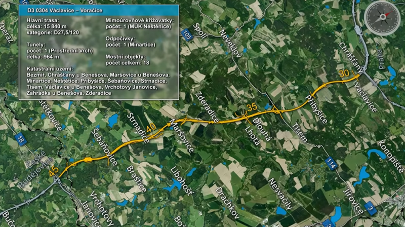 13.2. - Ředitelství silnic a dálnic (ŘSD) zaznamenalo další posun v přípravě stavby dálnice D3 na území Středočeského kraje. Magistrát hlavního města Prahy vydal územní rozhodnutí pro 15,8 kilometru dlouhý dálniční úsek Václavice – Voračice. ŘSD předpokládá, že všechny úseky středočeské D3 se začnou stavět najednou v roce 2028.