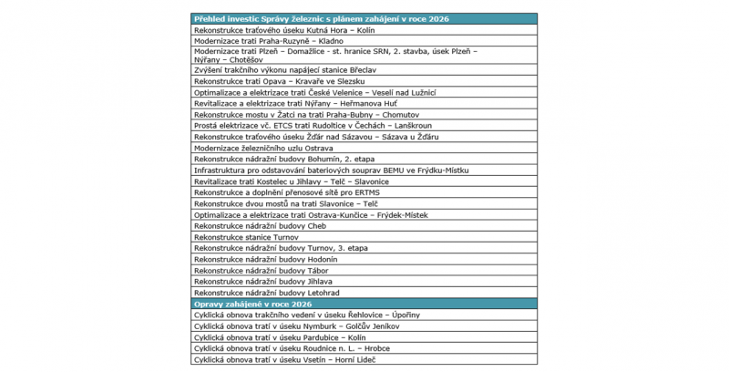 Rozběhne se modernizace úseku z Plzně přes Nýřany do Chotěšova, který se stane součástí moderní trati ze západočeské metropole do Bavorska, a začne dlouho připravovaná přestavba železničního uzlu Ostrava. Opravy se letos dočká poslední trať zasažená povodněmi na podzim roku 2024, z Opavy do Kravař.