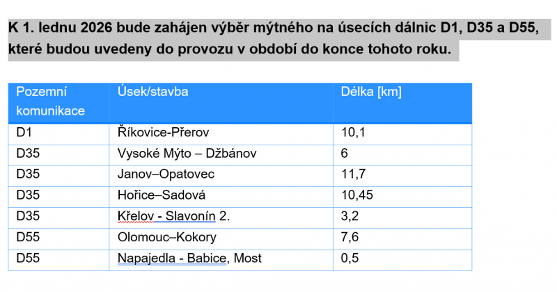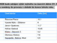 K 1. lednu 2026 bude zahájen výběr mýtného na úsecích dálnic D1, D35 a D55, které budou uvedeny do provozu v období do konce tohoto roku – viz tabulka ve fotogalerii.