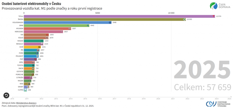 „Více než polovinu – konkrétně 51,9 % – provozovaných osobních bateriových elektromobilů v České republice dnes tvoří pouhé tři značky. V roce 2025 zaznamenala jednoznačně největší nárůst Škoda, která vloni registrovala 5,1 tisíce vozidel z celkových 11 tisíc. Naproti tomu dosavadní lídr segmentu, Tesla, s celkovým počtem zhruba 13 tisíc vozidel nedokázala navázat na mimořádně silný rok 2024 a v roce 2025 registrovala necelé dva tisíce vozidel. Volkswagen pak ve stejném období registroval přibližně 800 elektromobilů,“ uvedl ředitel Centra dopravního výzkumu Jindřich Frič.