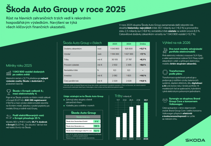 18.3. - Škoda Auto Group vloni dosáhla dalšího rekordního roku. Po již tak silném roce 2024 zvýšila česká automobilka na nové maximum tržby 30,1 miliardy eur (+8,3 %) a provozní zisk 2,5 mld. eur (+8,6 %), rentabilita tržeb byla na vysoké úrovni 8,3 %. Čistý peněžní tok též dosáhl nového maxima a vzrostl na 2,3 miliardy eur (+14,9 %). Celosvětové dodávky zákazníkům se zvýšily na 1 043 900 vozů (+12,7 %), a po šesti letech tak znovu překonaly milionovou hranici. V Evropě (EU27+4) se Škoda stala třetí neprodávanější značkou absolutně a čtvrtým nejžádanějším výrobcem mezi elektrickými vozy, zároveň v registracích nových vozů vykázala největší meziroční nárůst v žebříčku Top 10 značek. Slibně se rozvíjí expanze v zahraničí: rekordní dodávky zákazníkům zaznamenala Indie, ke spuštění výroby došlo ve Vietnamu a vedle posílení pozice v regionu ASEAN a na Blízkém východě se dařilo v Turecku nebo Maroku. V roce 2026 bude Škoda pokračovat v elektrifikaci modelové nabídky uvedením nových vozů Epiq a Peaq, čímž zdvojnásobí svou modelovou nabídku plně elektrických vozů. Tyto vynikající výsledky jsou ústředním tématem výročního videa, které přibližuje klíčové milníky uplynulého roku, dynamiku růstu i jasné ambice, jež stojí za pokračujícím úspěchem společnosti Škoda Auto.