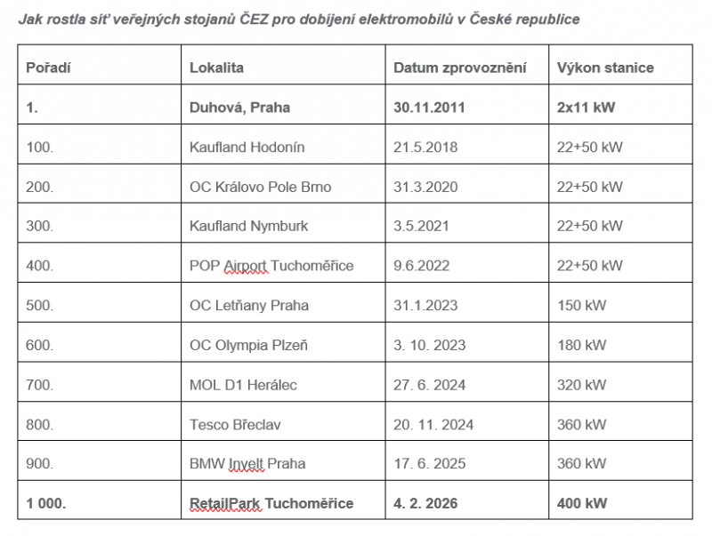 5.2. - Stojan číslo 1 000 ve středu oficiálně spustila největší a nejvýkonnější síť stanic v České republice. Jubilejní stanice je součástí velkého dobíjecích hubu ČEZ, který se nachází v areálu retail parku Portin v Tuchoměřicích ve středních Čechách. Prioritou i pro další měsíce je výstavba výkonných stojanů zkracujících časy dobíjení. Každý pátý stojan ČEZ je dnes ultrarychlý a letos jejich podíl v síti přesáhne 30 %. Síť roste díky prostředkům z Operačního programu Doprava i díky vlastním investicím Skupiny ČEZ.