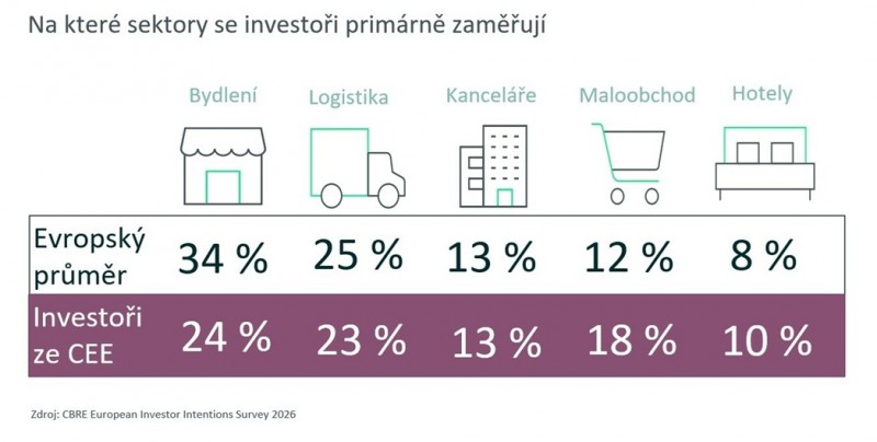 „Sektorové priority prošly v Evropě v posledních letech výraznou proměnou. Kanceláře, které v roce 2022 dominovaly s téměř 39 % zájmu investorů, klesly v roce 2026 na 13 %. Naopak rezidenční sektor (ať už jde o nájemní bydlení, soukromé kampusy pro studenty apod.) za stejné období posílil z 23 % na téměř 34 %. Logistika po svém vrcholu v roce 2024 ustálila svůj podíl na úrovni kolem 25 %. V regionu CEE je vývoj obdobný, investoři postupně přecházejí od dříve dominantní logistiky k vyváženějšímu portfoliu s rezidenčními nemovitostmi jako aktuálně hlavní prioritou, i když v celkovém objemu stále marginální. Na významu navíc nabývají i maloobchodní nemovitosti a především hotely, které po pandemii zažívají zejména v tuzemsku investiční boom,“ řekl Jakub Stanislav.