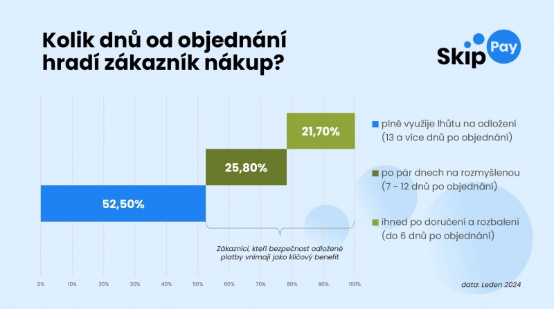 15.2. - Nejen pohodlné placení, ale především bezpečnost. Situace v české e-commerce výrazně mění vnímání funkce odložených plateb – jejich obliba meziročně opět vzrostla, a to takřka o pětinu. Z dat Skip Pay, jednoho z největších českých poskytovatelů této služby, vyplývá, že v průběhu Vánoc využívalo odloženou platbu dokonce až 47,5 % zákazníků i jako pojistku bezproblémového nákupu. Pomohlo také to, že odložená platba začíná zajímat i menší e-shopy, které si své jméno teprve budují: jejich zájem o tuto službu podle dat Skip Pay meziročně stoupl až čtyřnásobně.