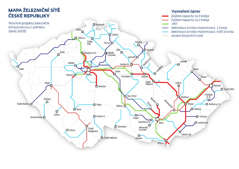 „Cestující vnímají železnici jako pohodlný, bezpečný a spolehlivý způsob dopravy. Pokud ale nemají jistotu, že se do centra města dostanou rychle a včas, zůstává pro ně často atraktivnější individuální automobilová doprava. Proto je nutné zaměřit investice tam, kde nejvíce pomohou zrychlit a zjednodušit cestování vlakem,“ řekl Petr Moravec, výkonný ředitel Svazu osobních železničních dopravců (SVOD Bohemia). V níže uvedené mapce je přehled konkrétních příkladů, kde je ze strany SVOD Bohemia potřebné z pohledu osobní dopravy vylepšit parametry a rozšířit kapacitu stávající infrastruktury.